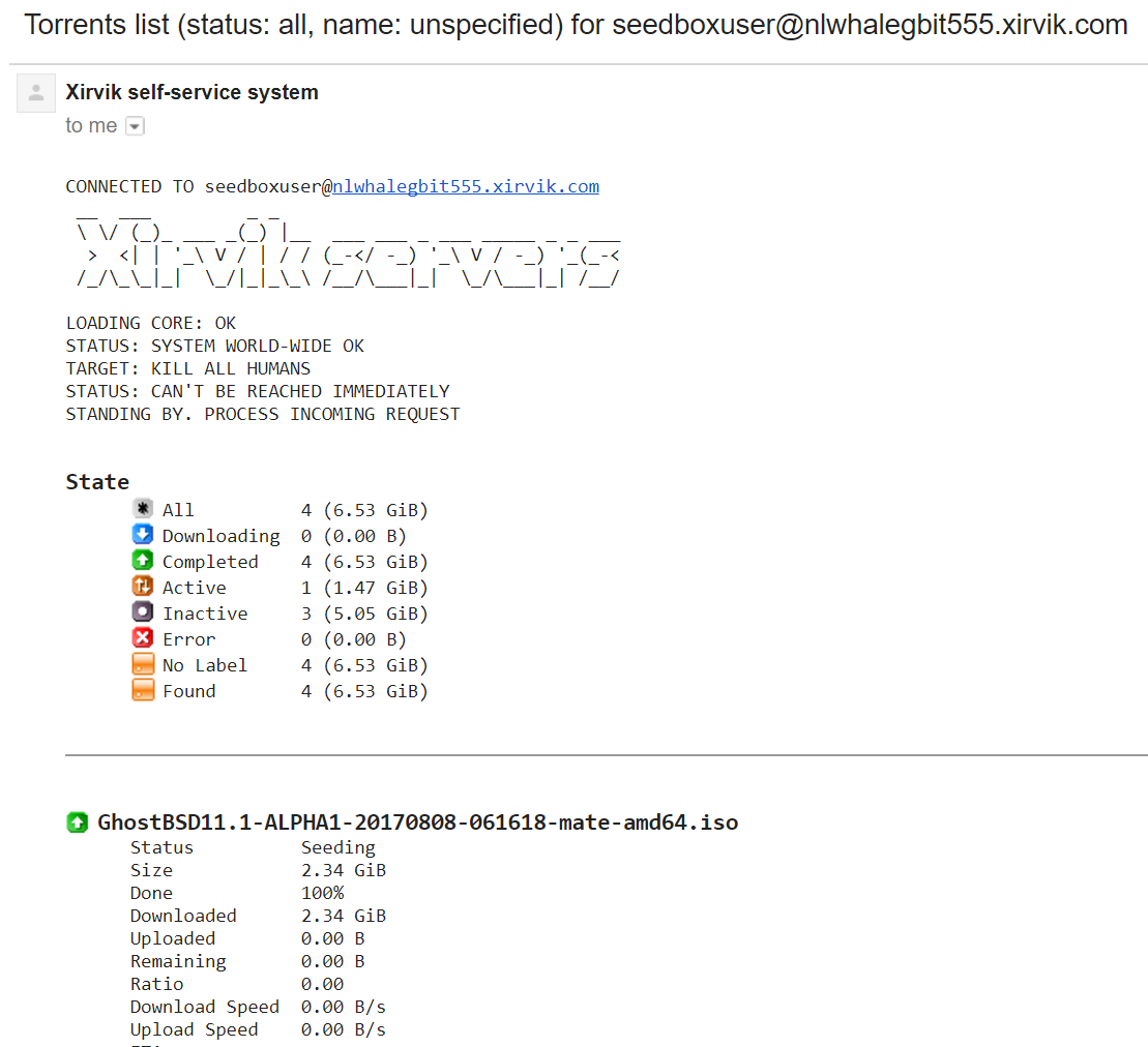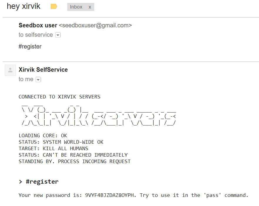 The body contains the line “#register” (all comands start with a #). The system replies with a password. Note that this password is only for the self service system. It's not your seedbox password.