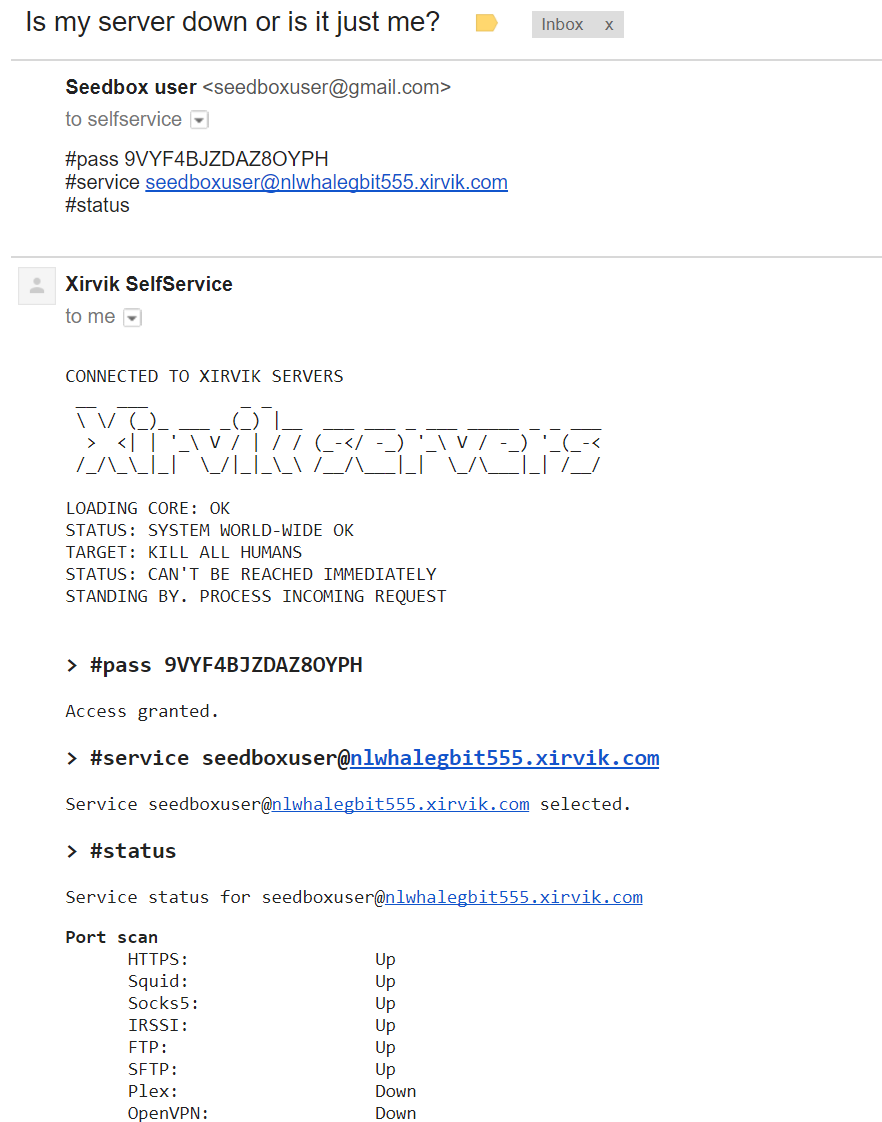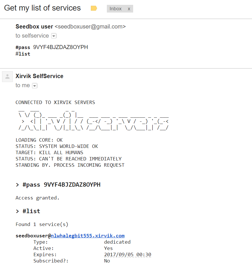 The self service system is easy to use once you get the hang of it. The first thing you need to do is register with it, by sending an email, from the same email we have on file, to selfservice@xirvik.com. The subject of the email is not important, in this example we just use “hey, xirvik” but anything would work.